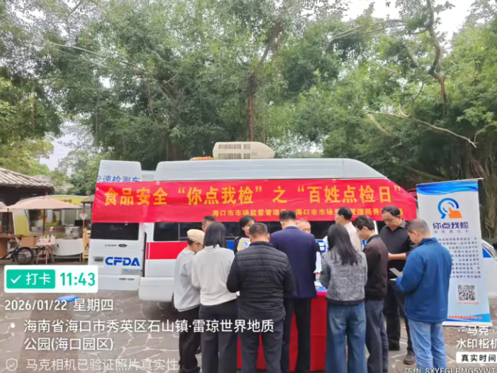 春节前夜,加强人平易近群众对年货食物平安的获得感和对劲度,营制食物平安社会共治共享款式,2026年1月22日,海口市市场监视办理局正在区火山口地质公园开展年货购食物平安“你点我检”之“苍生点检日”宣传勾当。